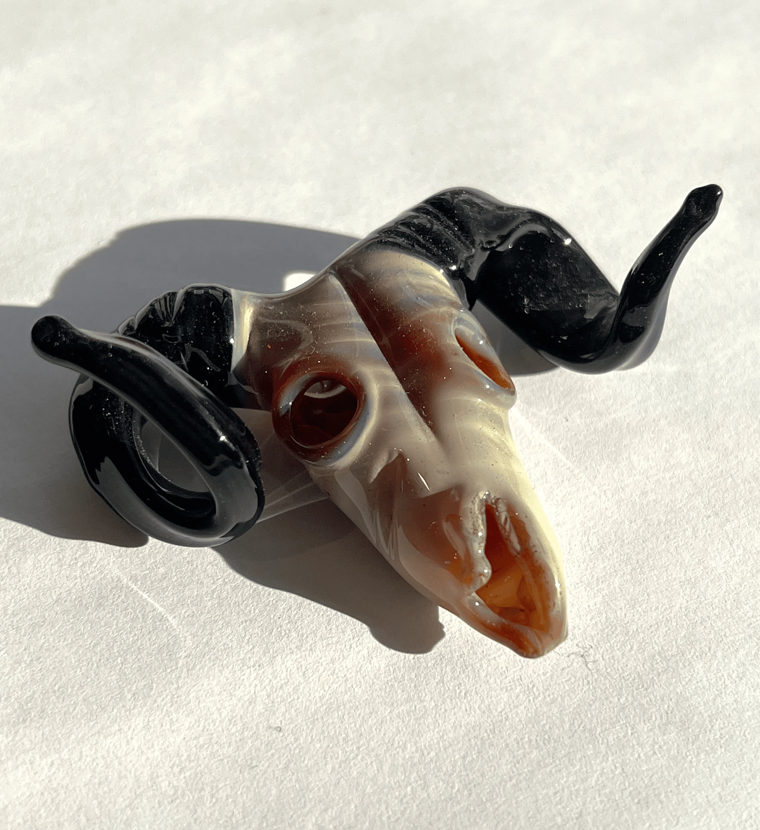 This small ram skull created by glass artist Jon Davidson is 2″ long from the top of the head to the tip of the nose. While the exterior is a muted neutral tone, looking into the skull’s eye sockets or nasal cavity reveal a rich, saturated burnt orange interior. A cord or chain can be looped through the eye sockets, allowing the piece to be worn as a pendant.