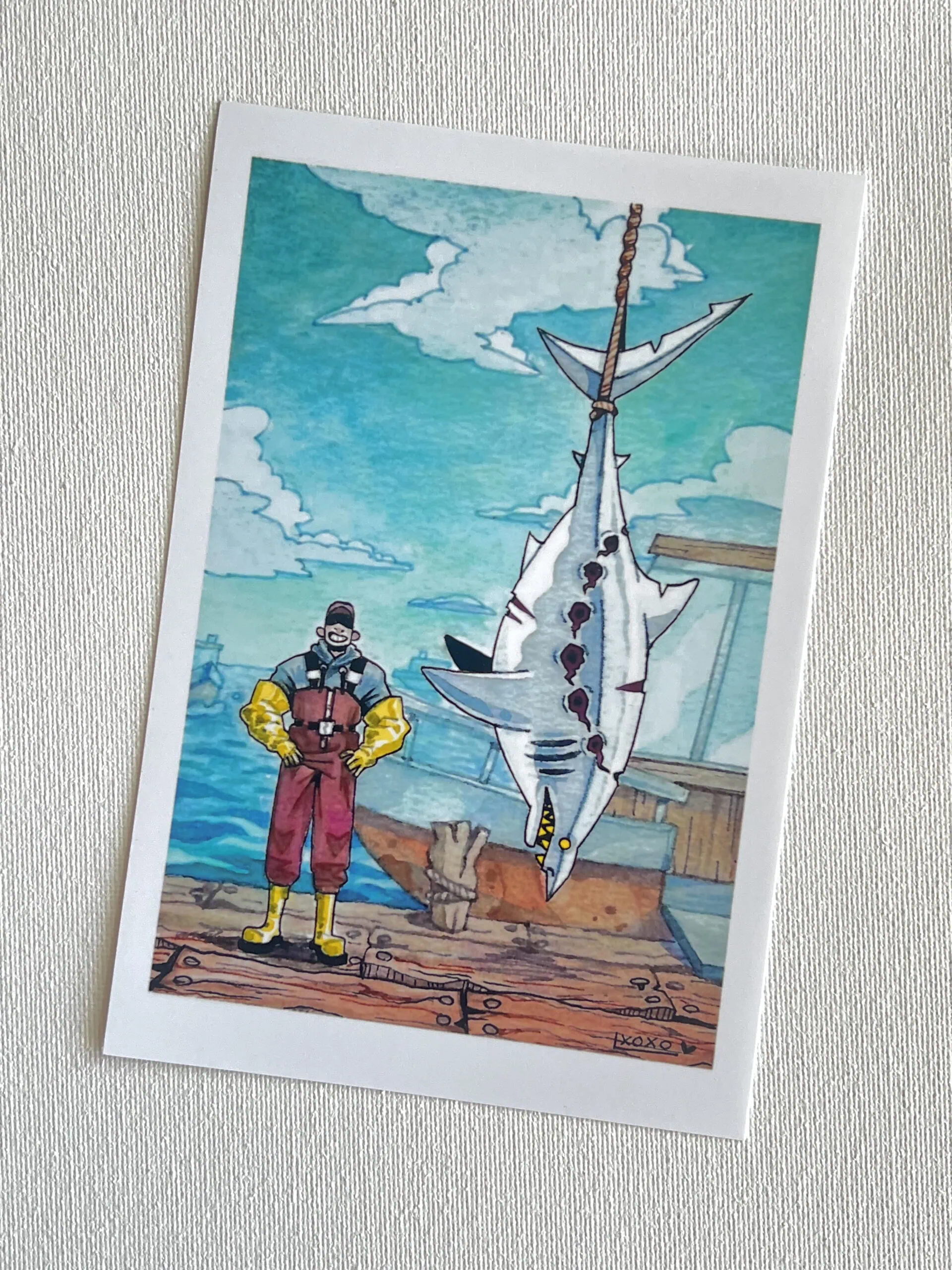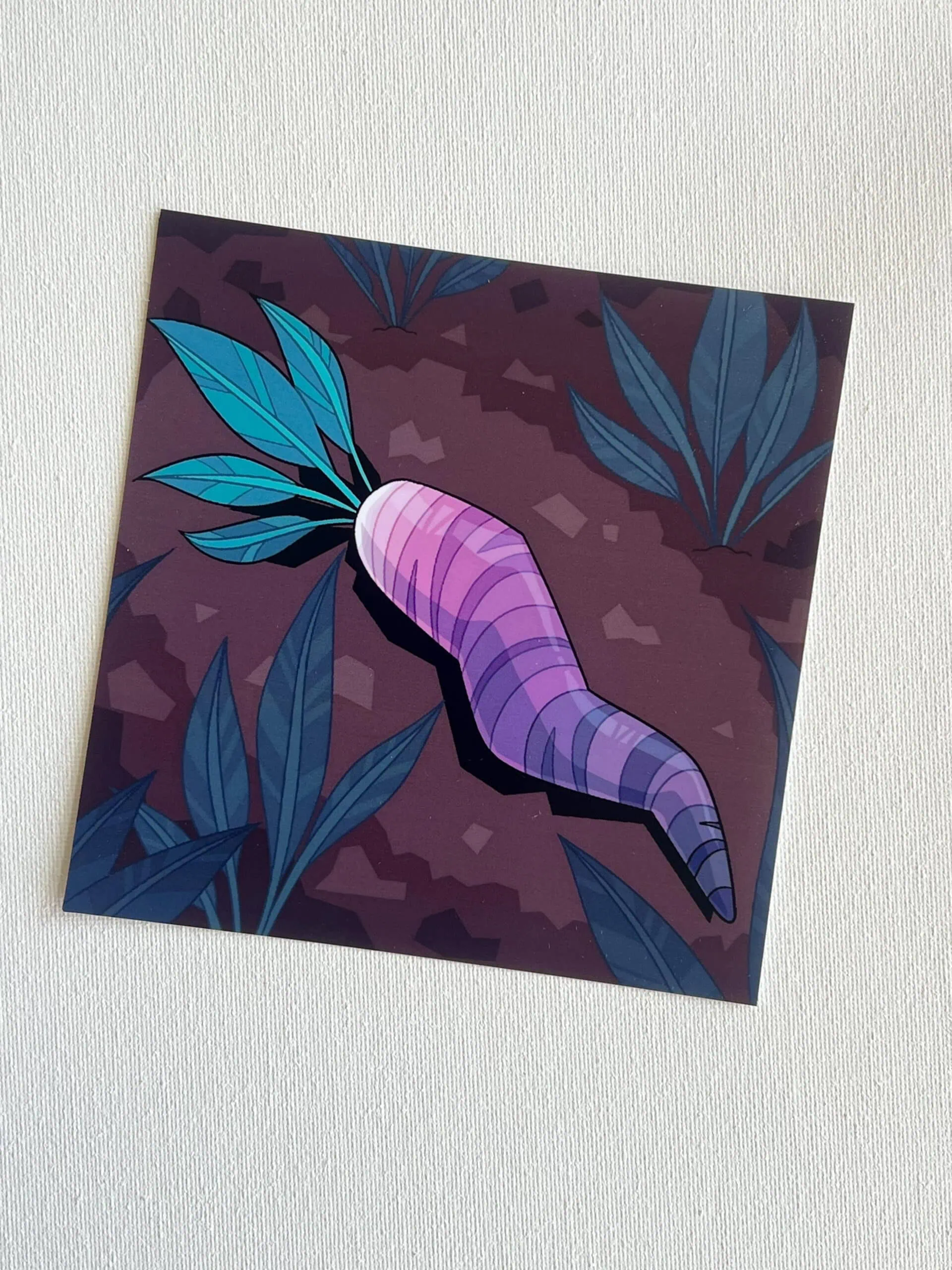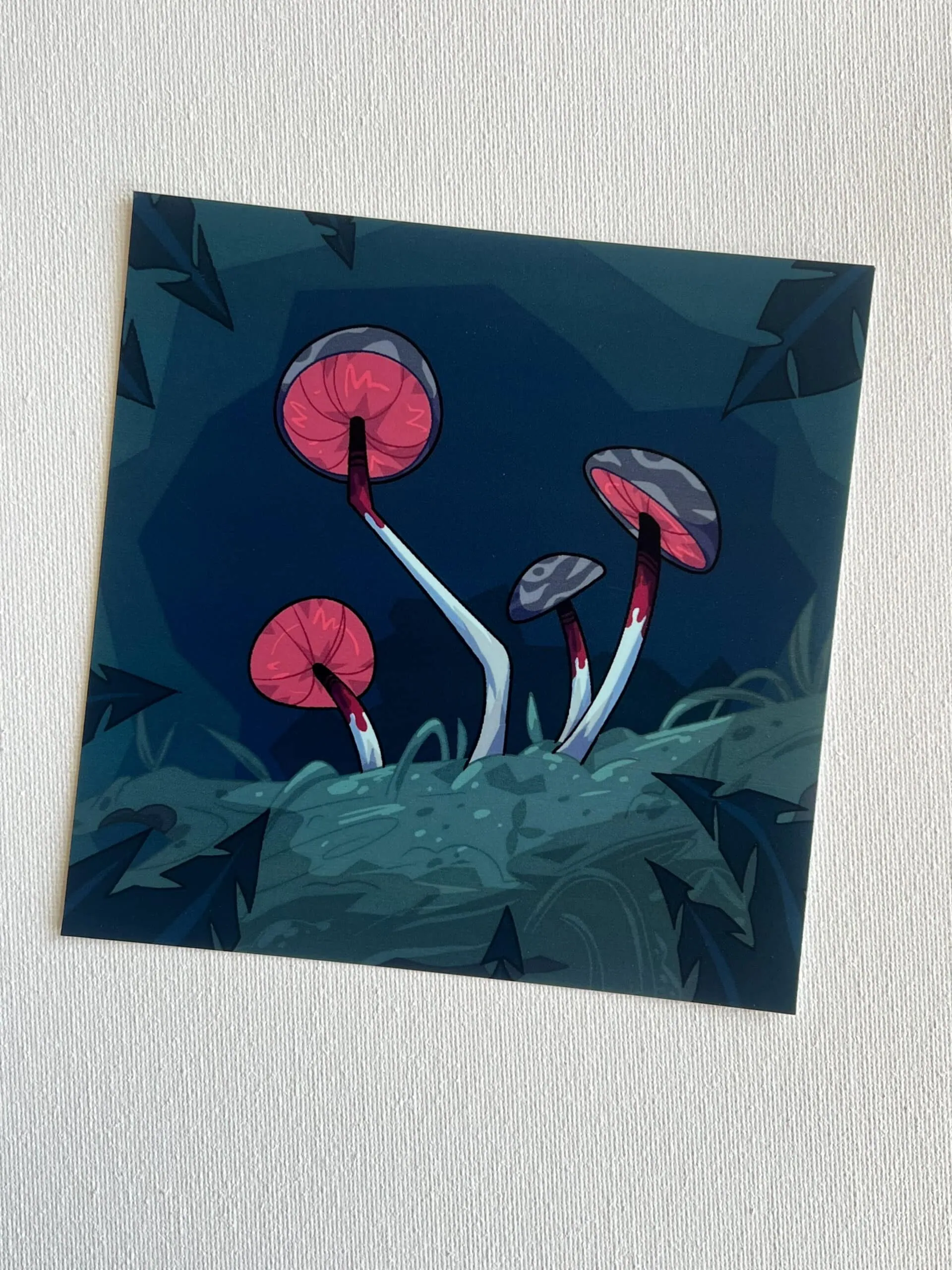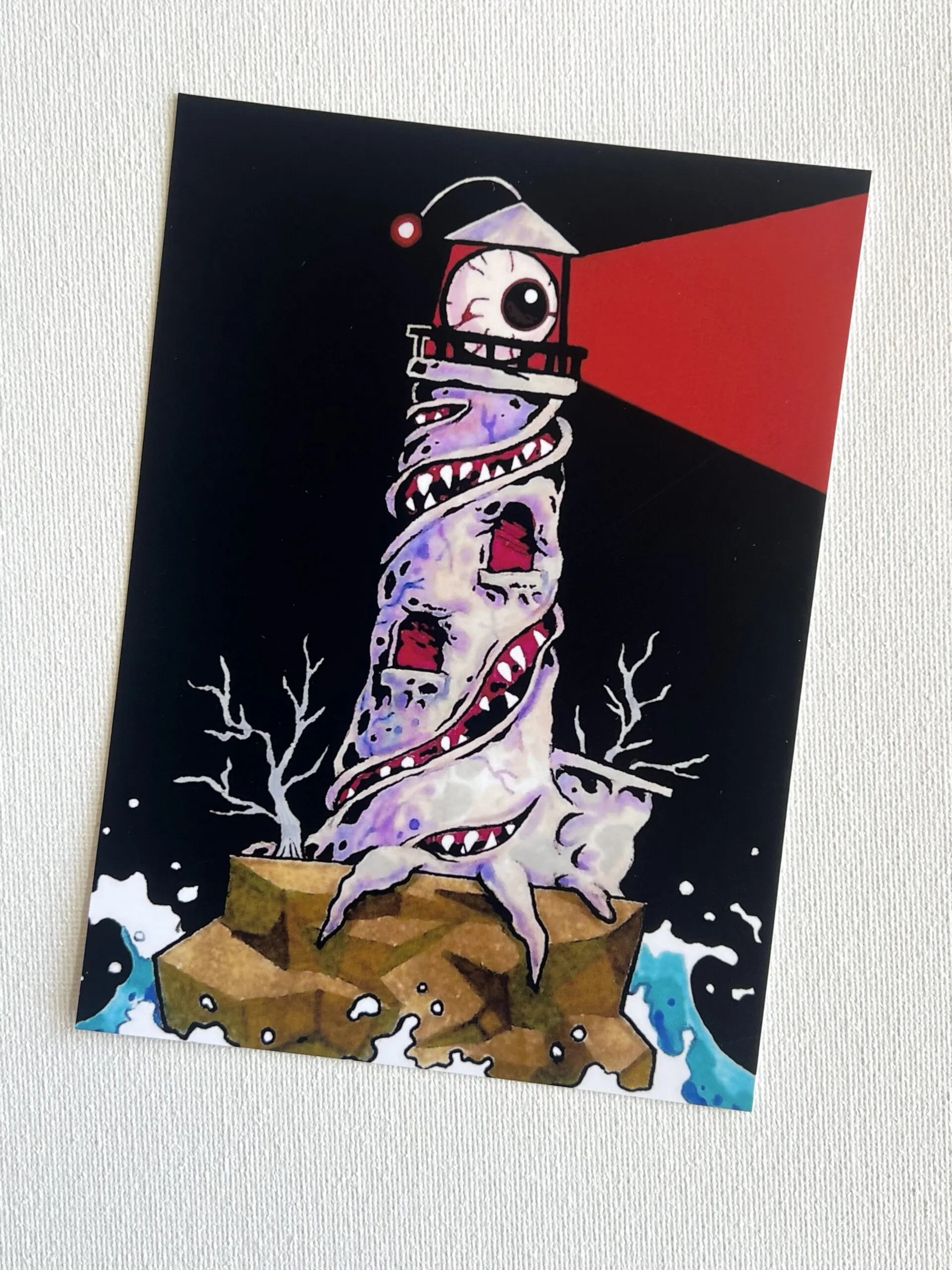 These digital prints by multimedia artist L Williams feature crisp details and vibrant colors. Two of the prints, Bleeding Cap and Soul Root, are prints of digital artworks, whereas the other two are scans of traditional artworks: Lighthouse an alcohol marker drawing and Bite a watercolor painting. The square prints are 5×5″ and the vertical ones 4×6″.